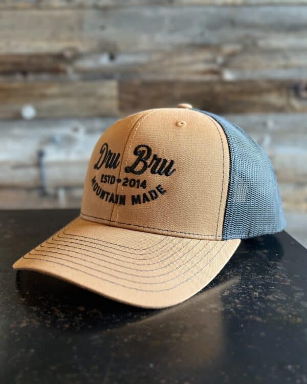 Our classic fit hat in tan/black with embroidery on the front panel. This Richardson brand snap-back trucker is a one size-fits most.